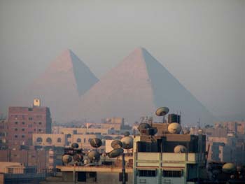 Tutto filava: il volo pomeridiano e l'albergo a Giza, ma un guasto all'aereo - prima di partire per fortuna - l'inevitabile ritardo e addio piramidi. Le vediamo in realtà ma di sfuggita, di notte, loro dietro al muro e arginate da un putiferio di condomini, noi in mezzo alla strada. Però ci appaiono anche la mattina dopo, fortuna vuole, dalla stanza d'albergo, immerse in una nebbiolina fumosa ergersi su una selva di parabole. Recitante come belve in gabbia o come oggetti preziosi? Eppure, anche se imprigionate e attanagliate dalla città, circondate da una sarabanda di traffico e frastornate da troppe luci, affascinano comunque con la loro mole, con la loro arditezza, con la loro storia.